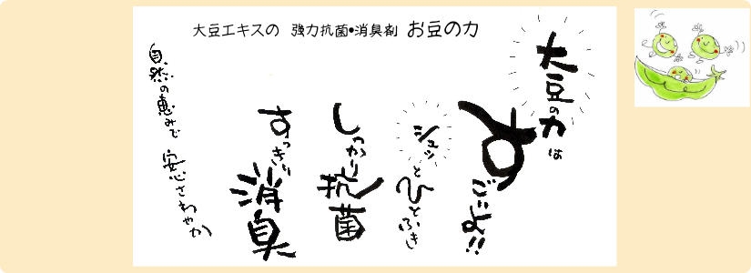 大地の恵みから生まれた強力抗菌・消臭剤強力抗菌・消臭剤 「お豆の力」大豆を中心として米・麦など穀物エキスを主成分とした安心な抗菌・消臭剤。無色・無臭なので、敏感な人も安心です。 お豆の力は・・・